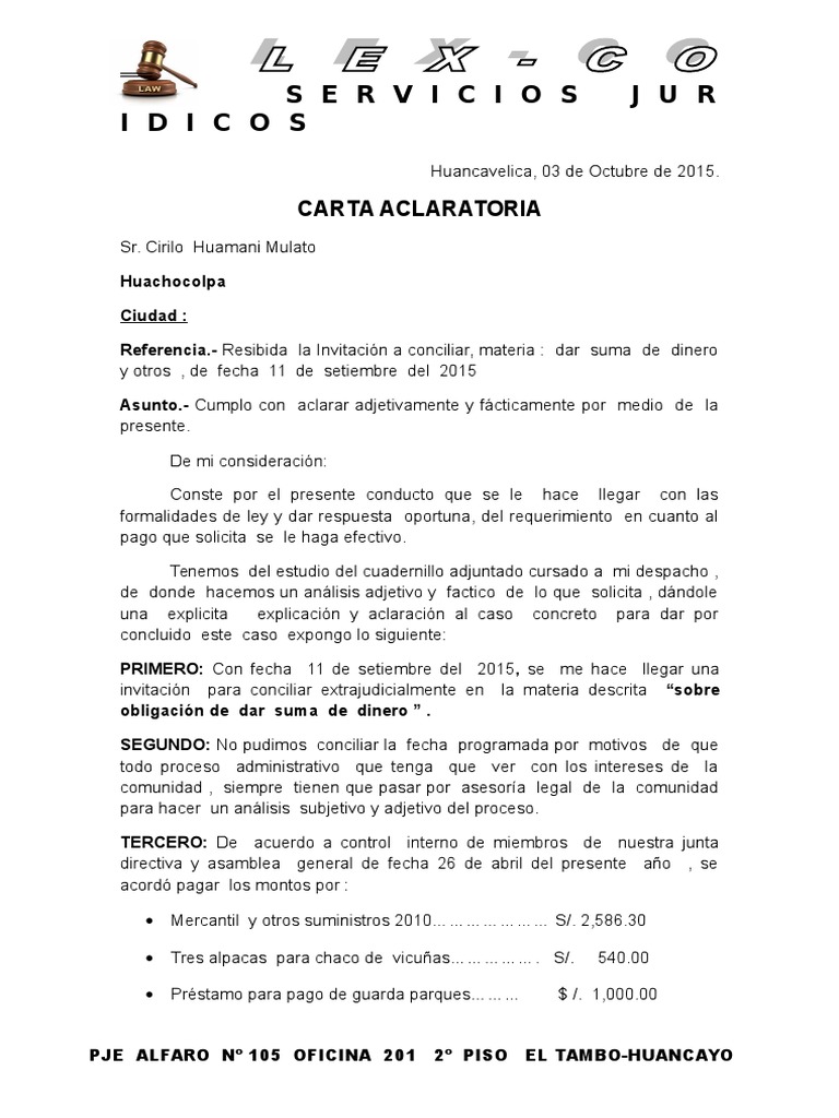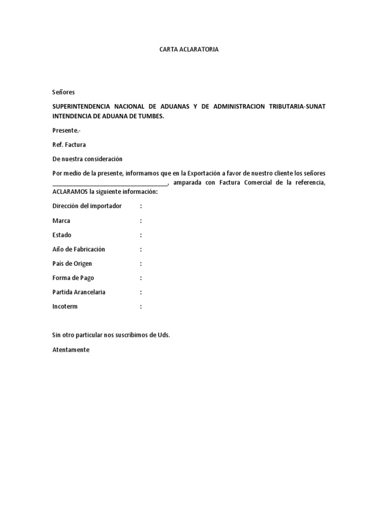 Modelo de carta aclaratoria a la sunat. La carta de aclaración o carta aclaratoria sirve para solicitar al destinatario ya sea éste una persona física o una entidad una serie de datos por lo general de carácter económico que resuma de manera concisa clara y transparente los distintos desgloses de dinero. Sustentación de inconsistencias o diferencias. La superintendencia nacional de aduanas y de administración tributaria sunat de acuerdo a su ley de creación n 24829 ley general aprobada por decreto legislativo nº 501 y la ley 29816 de fortalecimiento de la sunat es un organismo técnico especializado adscrito al ministerio de economía y finanzas cuenta con personería jurídica de derecho público con patrimonio propio y goza de autonomía funcional técnica económica financiera presupuestal.