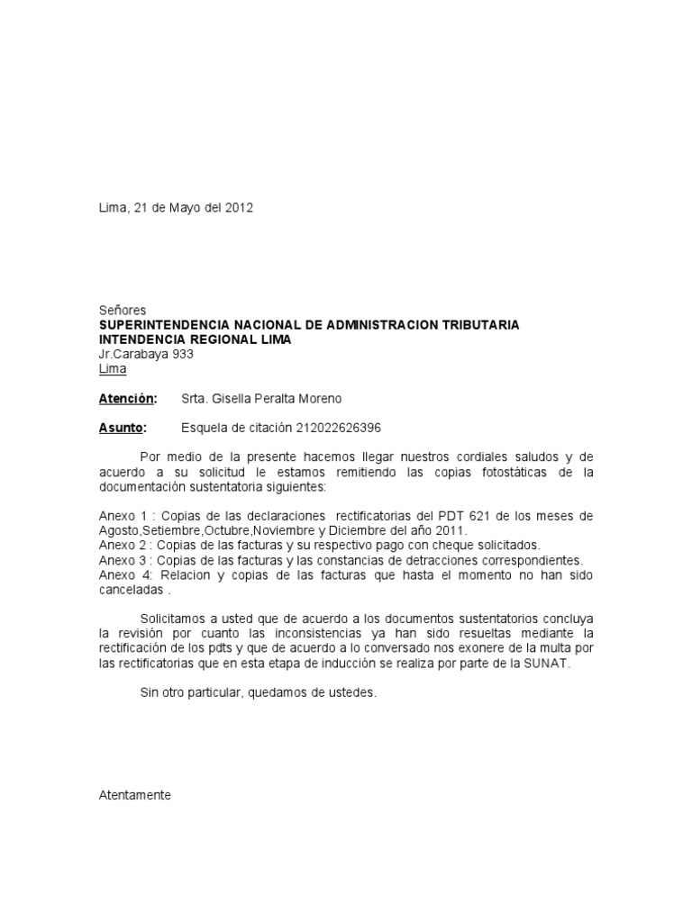 A la presente carta se debe adjuntar una copia simple de la resolución. Un modelo de carta sunat. También se puede utilizar para completar algunos datos o información faltante que no le permite a la otra parte conocer del todo un caso.