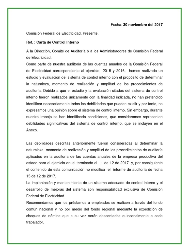 Modelos y formatos de carta de recomendación. Como parte de nuestra auditoría de la cuentas anuales de la sociedad xyz sa correspondiente al ejercicio 20xx hemos realizado estamos realizando un estudio y evaluación del sistema de control interno con el propósito de determinar la naturaleza momento de realización y amplitud de los. Un modelo carta recomendación es un formato eficaz utilizado principalmente en los tediosos procesos de selección de personal.